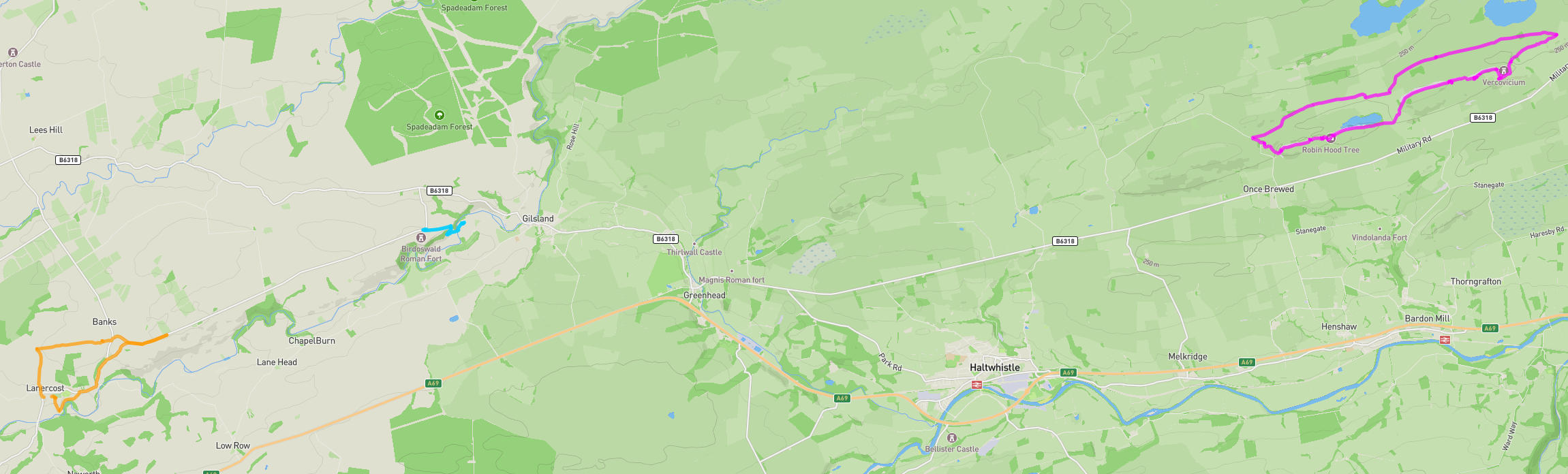The picture above shows the 3 walks we did. The one that we would say is a must is the rightmost/pink one. It's also the one pictured below and the walk in the GPX file. It shows the "most" of what's left of the wall, has a ruined fort half way, and gets great views both from the wall and of the wall when walking back (depending which way around you go). Also has the (now) very sad Sycamore Tree Gap.
